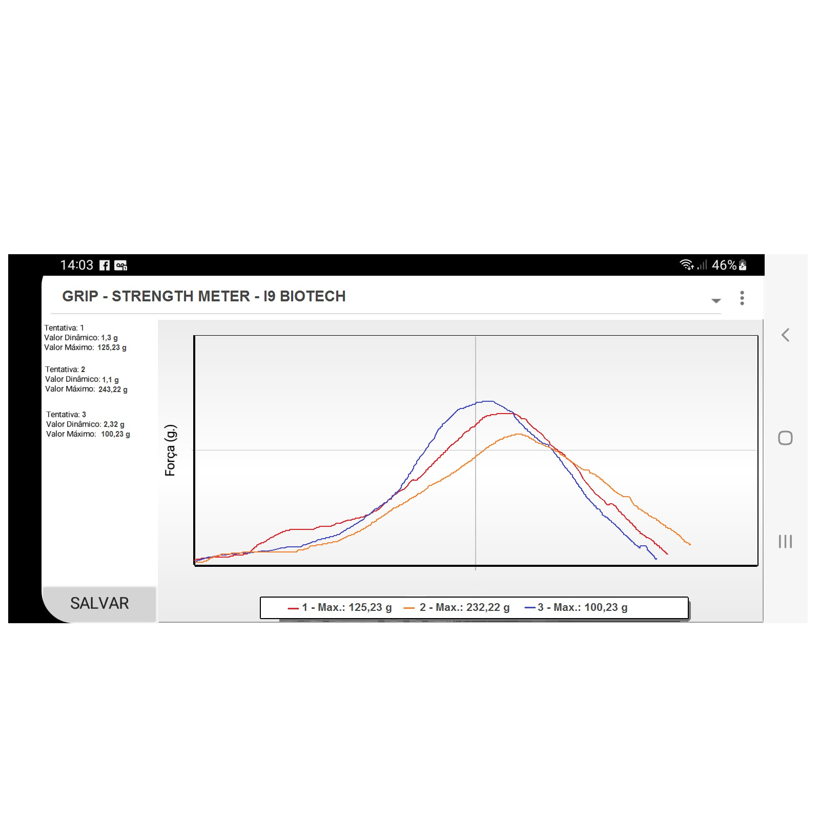 O software em plataforma Android e Windows montam gráficos de tentativas coletando a força máxima em função ao tempo. Os dados e gráficos gerados são exportados para relatórios em formato PDF.