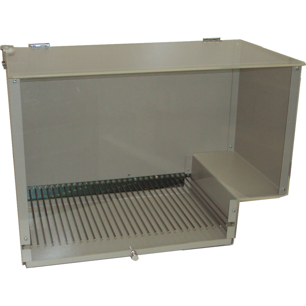 Equipamento confeccionado em alumínio de 2 mm, com pintura epóxi de alto impacto, na cor bege claro, chão em barras de aço inoxidável com espaçamento de 12,5mm, área interna de fuga com 200 mm x 75 mm, porta e frente em acrílico transparente, bandeja coletora de dejetos e urina